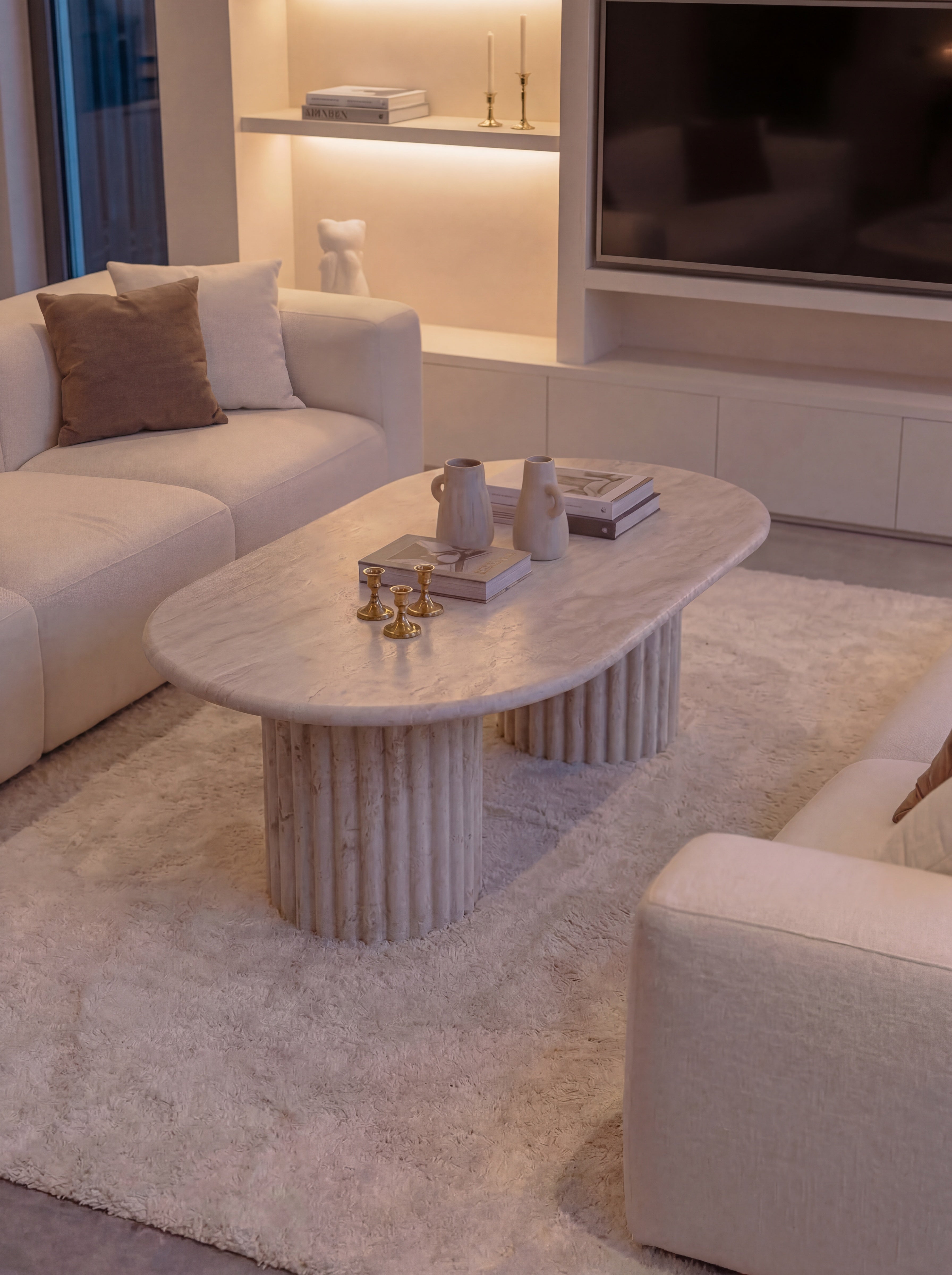 130 × 65 cm | Height: 38 cm | 100% Solid Premium Travertine An elegant pairing of form and function — sculptural tabl... -