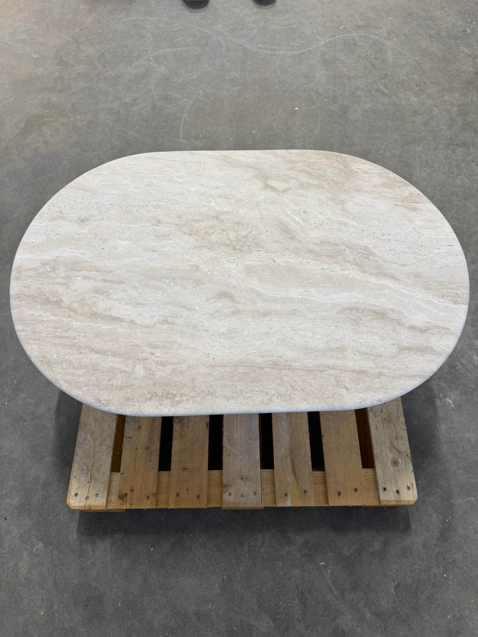 Crafted from solid premium travertine, this coffee table embodies both architectural presence and natural subtlety. The tabletop, a softly contoured oval measuring 120 x 80 cm, is cut from a 2 cm thick slab — its gently honed surface preserving the organic beauty and veining of the stone.